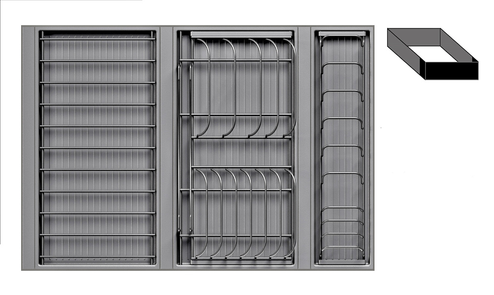 • 1 большой модуль для посуды + 1 малый модуль с решеткой + модуль для столовых приборов