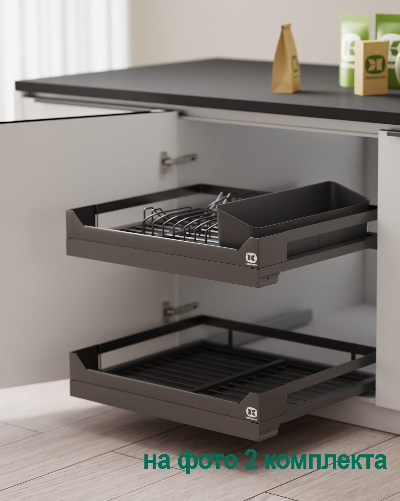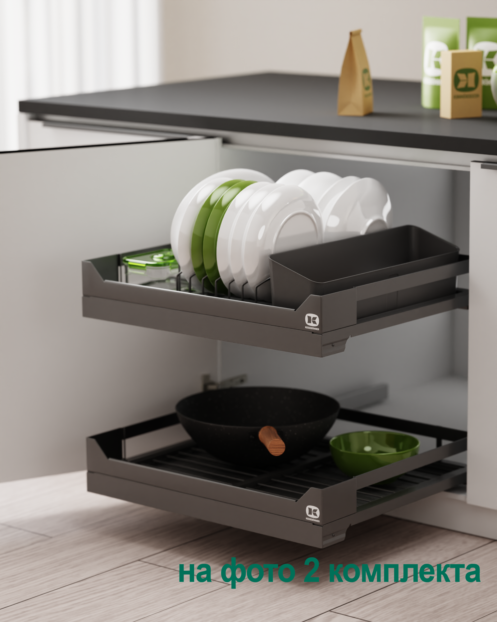 Ответ: Используйте модульную систему diningAGENT от Kesseböhmer — с полным выдвижением, возможностью мытья поддонов в посудомойке, защитой от царапин и функцией сервировочного подноса. Подходит для тарелок, блюд, чашек и столовых приборов. Доступна в цветах титан и антрацит, с доводчиком и нагрузкой до 12 кг.