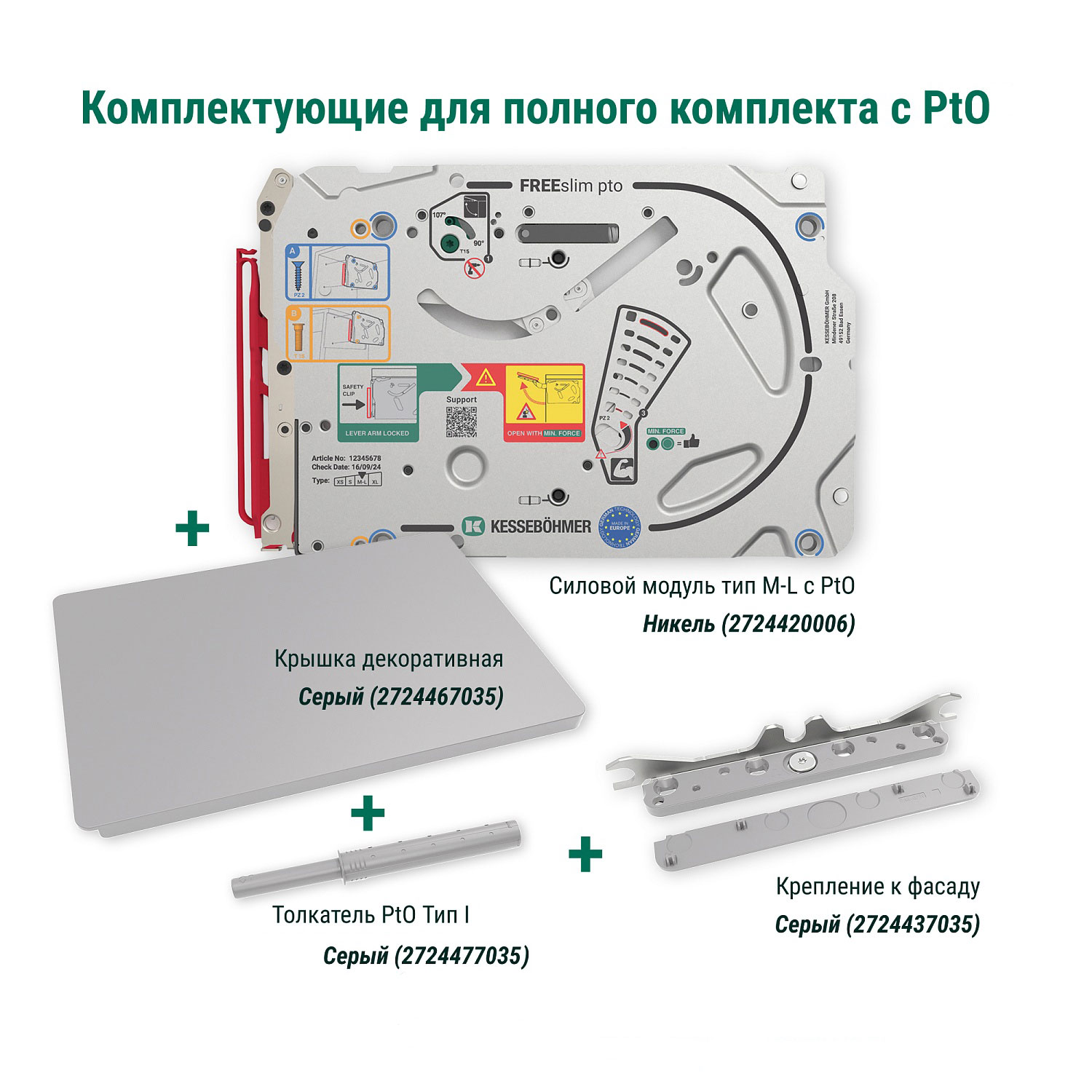 Полный комплект ультратонкого подъемного механизма ФриСлим ФЛАП Kesseböhmer c толкателем PTO тип I для накладного монтажа, цвет СЕРЫЙ