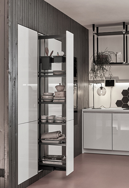 • Высокая нагрузка на механизм в 100 кг (по 18 кг на полку) позволяет организовать хранение большому количеству предметов, при этом даже при полной загрузке система выдвигается легко.