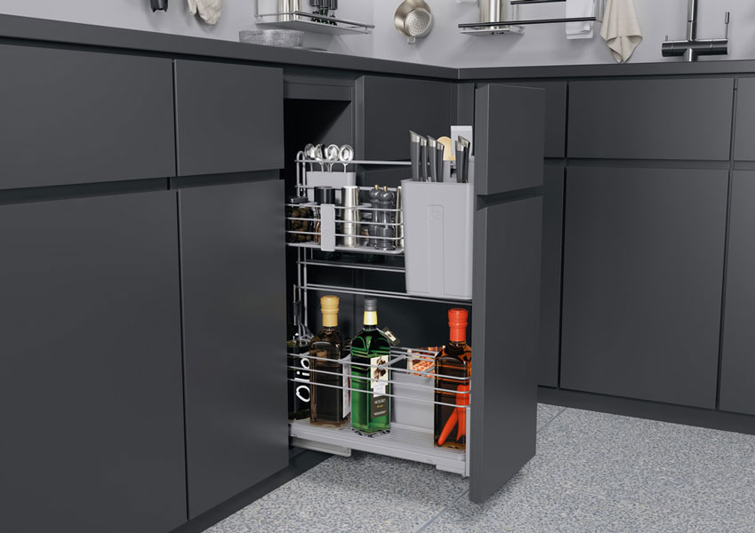 В комплект входит: 1 рама с направляющими полного выдвижения, 1 держатель для ножей с пластиковой вставкой, 2 опоры для разделочных досок, 1 держатель для столовых приборов, 1 держатель для кухонных принадлежностей, 2 подвесных модулей, 1 полка для бутылок с делителями, 2 контейнера для хранения.